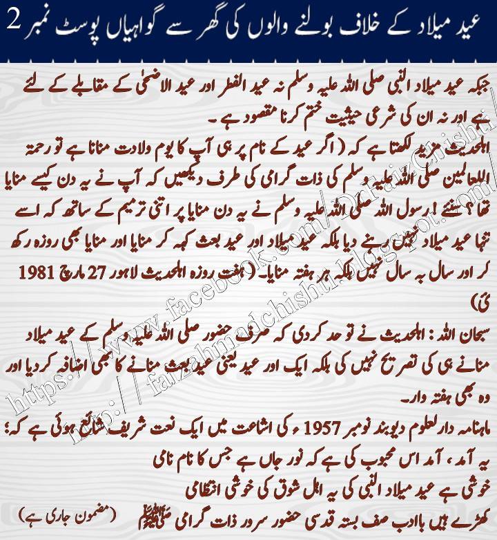 کہتے ہیں کہ ’’کسی معتبر کتاب میں یوم میلاد کو عید نہیں لکھا گیا‘‘ فی الوقت میرے پاس موجود کتاب کے اعتبار کے لئے صرف اتنا ہی کہوں گا کہ اشرف علی تھانوی صاحب نے اور تمام علمائے دیوبند نے اس کتاب کو اپنی تحریروں کی وقعت ظاہر کرنے کے لئے حوالہ دے کر جگہ جگہ اس کا ذکر کیا ہے اور نشرالطیب تو اس کتاب کے حوالوں سے بھری ہوئی ہے اور معترضین کی مزید تسلی کے لئے عرض ہے کہ اس کتاب کے عربی متن کے اردو ترجمہ پر تعریفی تقاریظ علمائے دیوبند نے لکھی ہیں۔ اس کتاب کا نام ’’مواہب اللدنیہ‘‘ ہے ترجمہ کو ’’سیرۃ محمدیہ‘‘ بھی کہا جاتا ہے۔